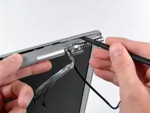 Вставьте плоский конец лопатки в щель между задней рамкой дисплея и крышкой шарнира.