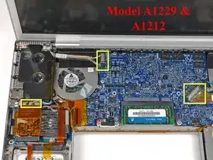 Для моделей A1229 и A1212 отключите три антенных кабеля от карты AirPort Extreme и три разъёма, выделенные на логической плате.