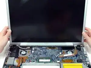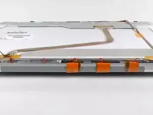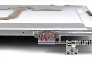 Удалите десять серебристых винтов T6 Torx, фиксирующих дисплей (по пять с каждой стороны — обратите внимание, что внутренние винты с обеих сторон длиннее и имеют тоньшую головку).