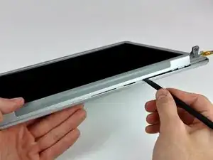 Вставьте плоский конец лопатки перпендикулярно плоскости дисплея между пластиковой полосой, прикреплённой к задней рамке, и передней рамкой.