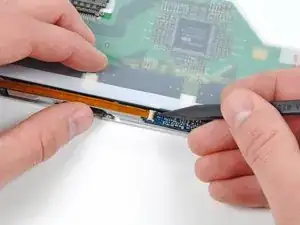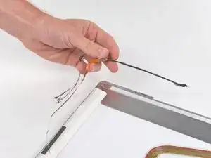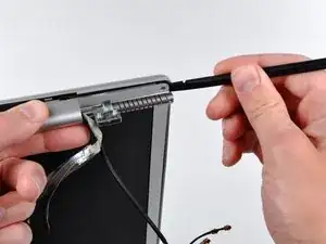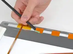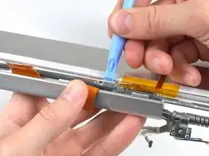 Используйте плоский конец лопатки, чтобы аккуратно отклеить три антенные перемычки, приклеенные к нижнему краю ЖК-панели.