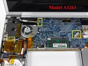 Для модели A1261 отключите два антенных кабеля от карты AirPort Extreme и три разъёма, выделенные на логической плате.