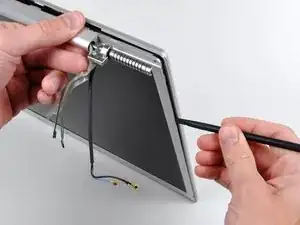 Теперь, когда правый и нижний края задней рамки слегка отделены от передней рамки, используйте лопатку, чтобы отжать заднюю рамку от защёлок около нижнего правого угла дисплея.