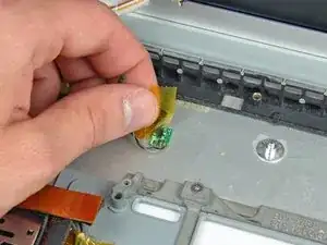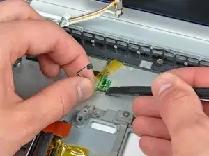 Используйте плоский конец лопатки, чтобы поддеть и отсоединить плату левого термодатчика от клеевого крепления, фиксирующего её к нижнему корпусу.