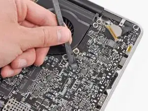 Удалите три крестовых винта Phillips длиной 3,1 мм, фиксирующих левый вентилятор к плате.