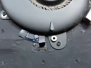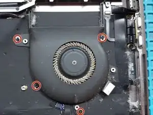 Используйте отвёртку T3 Torx, чтобы выкрутить четыре винта длиной 2,1 мм, крепящих левую плату вентилятора.