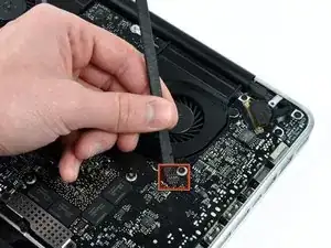 Снимите три винта Torx T6, крепящих левый вентилятор к материнской плате.