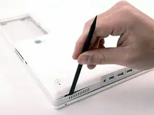 Над оптическим приводом находятся три защёлки, которые нужно освободить перед снятием нижней крышки. Вставьте лопатку в нижнюю крышку над оптическим приводом и проведите её к задней части компьютера, пока не услышите три отчётливых щелчка.