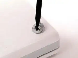 Используйте штифт (или любой другой предмет) для снятия трёх резиновых ножек с нижней крышки.