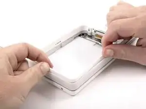 Вдавите тонкие кромки нижней крышки вокруг отсека батареи, прогнув их мимо защёлок, затем приподнимите, чтобы освободить этот угол нижней крышки.