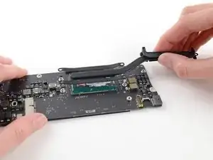 Удалите один винт T5 Torx длиной 2,85 мм, который фиксирует SSD к плате логики.