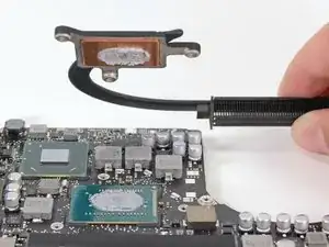 Удалите три крестовых винта #1 Phillips длиной 8,4 мм, крепящие радиатор к логической плате.