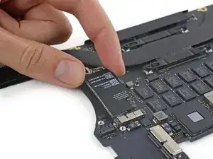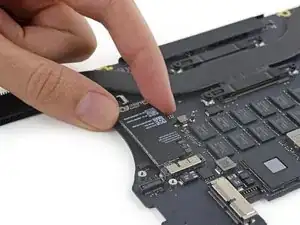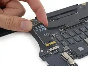 Удалите один винт T5 Torx длиной 2,9 мм, крепящий SSD к логической плате.