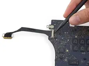 Используйте наконечник лопатки, чтобы перевернуть фиксатор кабеля данных дисплея и повернуть его в сторону разъёма питания MagSafe 2 на корпусе компьютера.