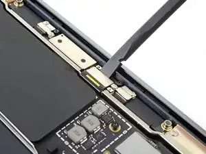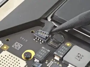 Используйте плоский конец лопатки, чтобы приподнять разъём кабеля трекпада и вытащить его из гнезда.