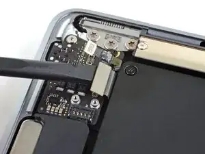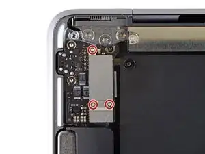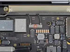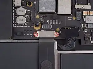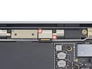 Используйте отвертку T3 Torx для удаления двух винтов по 1.5 мм, удерживающих крышку разъёма кабеля дисплея.