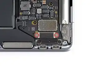Используйте отвертку T3 Torx для удаления двух винтов по 1.4 мм, удерживающих крышку кабеля трекпада.