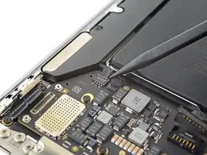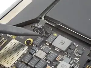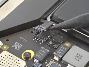 Используйте плоский конец лопатки, чтобы приподнять разъём кабеля USB-C и вытащить его из гнезда на логической плате.