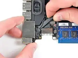 Учитывая множество разъёмов около его краёв, поднимите плату логики с конца, ближайшего к оптическому накопителю.
