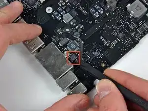 Apple приклеивает небольшую полосу прозрачного пластика с клеевой стороной к плате за разъёмом кабеля камеры, чтобы удерживать его в гнезде. При отодвигании этой полосы будьте осторожны, чтобы не оторвать поверхностно-монтируемые компоненты от платы.