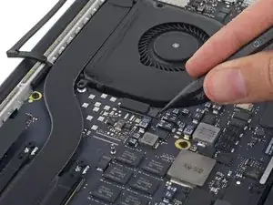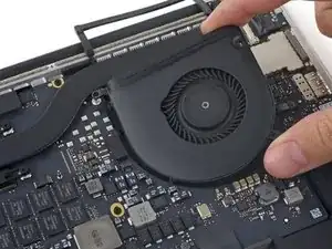 Поднимите вентилятор и аккуратно сдвиньте его в направлении заднего края MacBook, чтобы освободить кабель вентилятора из его разъёма.