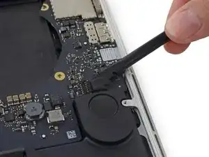 Поднимите вентилятор и аккуратно сдвиньте его в сторону заднего края MacBook, чтобы освободить кабель вентилятора из гнезда.
