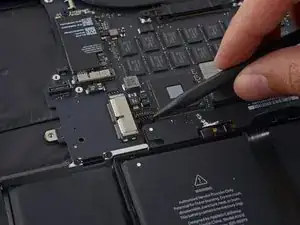 Используйте плоский конец лопатки, чтобы отсоединить разъём кабеля тачпада от его гнезда на плате.
