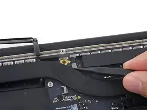 Используйте наконечник лопатки, чтобы отогнуть фиксирующий клапан на ZIF-разъёме ленточного кабеля клавиатуры.