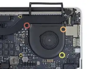Используйте отвертку T5 Torx, чтобы удалить три следующих винта, крепящие правый вентилятор к логической плате: