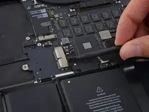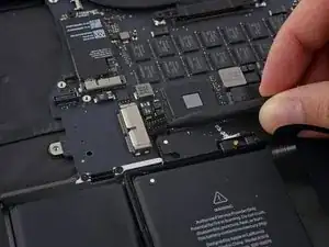 Снимите два винта Torx T5 длиной 2,2 мм, фиксирующие крышку разъёма кабеля тачпада на плате.