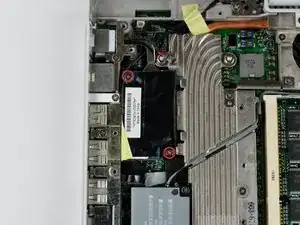Удалите два винта Phillips, удерживающие плату питания (DC-In), снимая при необходимости скотч.