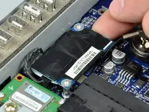 Удалите два винта Torx T6 длиной 5.5 мм, крепящие кронштейн AirPort к материнской плате.