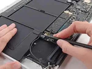 При сборке обратно используйте плоский конец лопатки, чтобы уложить антенный модуль Wi‑Fi/Bluetooth обратно в его канал.