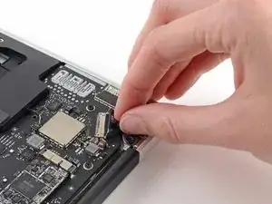 Возьмите прозрачную пластиковую тяговую ленту, прикреплённую к разъёму батареи, и потяните её параллельно плате в направлении переднего края Air.