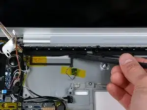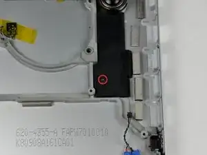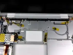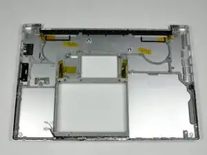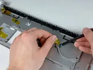 Будьте осторожны при снятии шлейфа клавиатуры-трекпада, чтобы задняя часть верхнего корпуса была освободена от области рядом с петлей. Легко случайно согнуть приемники винтов по обе стороны клавиатуры.