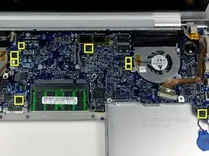 Восемь серебряных винтов Torx T6 4.7 мм, фиксирующих логическую плату к нижнему корпусу.