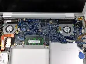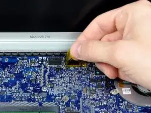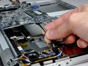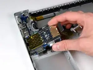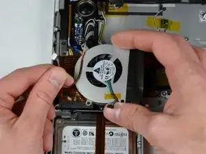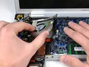 Удерживайте логическую плату одной рукой и воспользуйтесь другой рукой, чтобы приподнять левый вентилятор из его посадочного места. На левом вентиляторе есть кусок черной изоленты, фиксирующий его к радиатору. Аккуратно снимите эту ленту с радиатора, поднимая левый вентилятор.