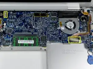 Поместите левый вентилятор над картой Airport. Не обязательно полностью снимать вентилятор из компьютера.