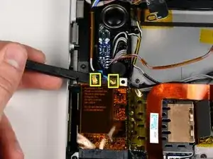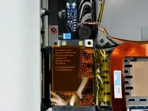 Снимите оранжевую ленту Kapton, удерживающую кабель правого температурного датчика к материнской плате.