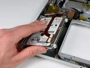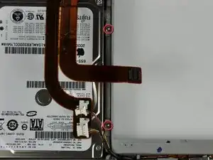 Удалите два серебряных винта Torx T6, фиксирующих фиксирующую скобу жесткого диска к нижнему корпусу.