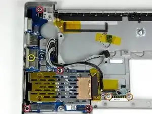 Удалите единственный черный винт Torx T6 длиной 6 мм, удерживающий верхнюю часть материнской платы к нижнему корпусу.