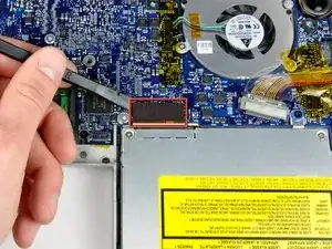 Используйте плоский конец лопатки, чтобы отключить шлейф SuperDrive оранжевого цвета от материнской платы, по необходимости устраняя ленту.