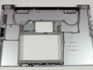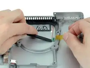 Если у вас MacBook Pro 17" модель A1229 или A1261, повторите этот процесс для левого термодатчика. Обратите внимание, что расположения отличаются: правый находится рядом с приёмником винта внутреннего вентилятора. Левый расположен по линии с приёмником винта, но на 20 мм вперёд от него.