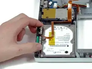 Поднимите жёсткий диск с правой стороны и извлеките его из компьютера. Модуль Bluetooth и оранжевая ленточная плата всё ещё прикреплены к жёсткому диску и выйдут вместе с ним.