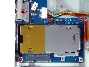 Снимите четыре чёрных винта T6 Torx длиной 4 мм, закрепляющих левую плату ввода/вывода к нижнему корпусу.