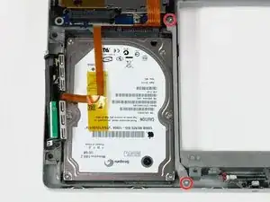 Снимите два серебристых винта T6 Torx, закрепляющих серую металлическую прижимную планку с правой стороны жёсткого диска.