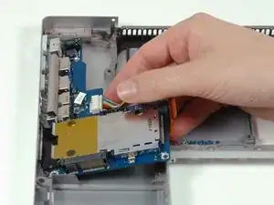 Поднимите левую сторону логической платы и отключите разноцветный разъём питания с нижней стороны платы.