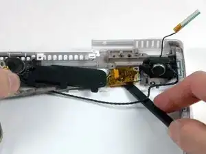 С помощью лопатки отсоедините разъём правого динамика и разъём Bluetooth от логической платы.