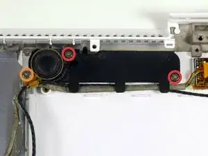 Снимите два винта Phillips, фиксирующие плату MagSafe и левый динамик к нижнему корпусу.