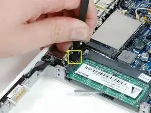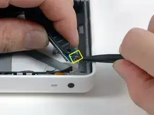 Отключите только что открывшийся шлейф передачи данных дисплея. Если на верхней части разъёма нет язычка, может помочь использование лопатки для отсоединения разъёма.